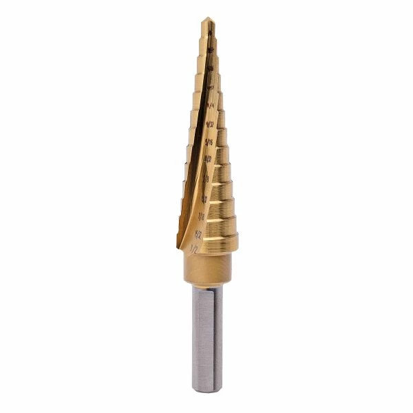These cobalt alloy step drill bits allow you to easily drill holes from 1/8 to 1/2 inch. These bits are M42 Grade Cobalt with a Titanium Nitride Coating (TiN) with laser marked sizes for easy identification.